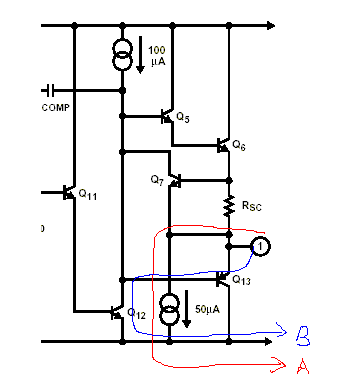 当灌电流较大,大于50微安,恒流源无法完全吸收,剩余的电流经过Q13